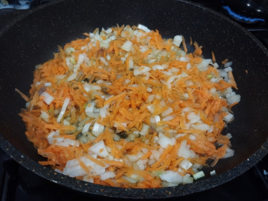 Сковороду с антипригарным покрытием и невысокими бортами разогрейте на сильном огне. Влейте подсолнечное масло и хорошенько прогрейте его. Огонь уменьшите до среднего. Выложите морковь и лук обжариваться до мягкости. Это займет около пяти минут. Периодически перемешивайте овощи, чтобы они не пригорели.