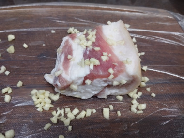 Сало порезала на порционные куски. Чеснок очистила, несколько долек добавила в воду,в которой растворила соль.