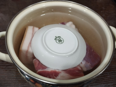 4. Накройте сало в рассоле крышкой, поставьте на нее груз. Уберите на трое суток в холодильник.