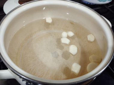 3. Налейте в кастрюлю воды, добавьте в нее соль, перемешайте, пока она не растворится. Туда же выложите чеснок и опустите пузанину.