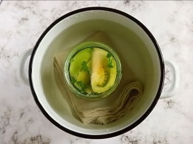 Простерилизуйте зелёные помидоры дольками в кипящей воде 15 минут.