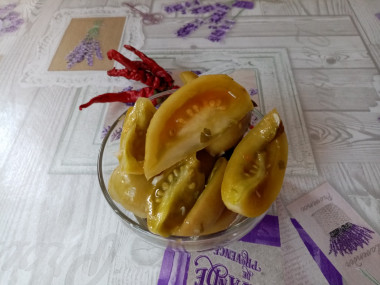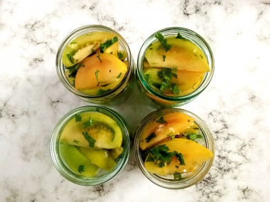 Захотелось мне сделать зеленые помидоры дольками на зиму. Только вот мои помидоры пока ждали своей очереди немного пожелтели. Но все равно я следовала шагам рецепта и закатала четыре баночки этой вкусняшки).