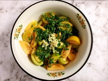 В глубокой ёмкости перемешайте зелёные помидоры с зеленью, чесноком и перцем.