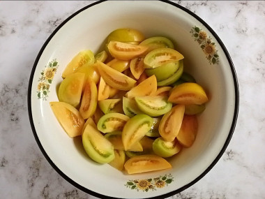 Зелёные помидоры вымойте, разрежьте на четвертинки (если помидоры небольшие) или более мелкие дольки.