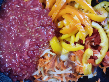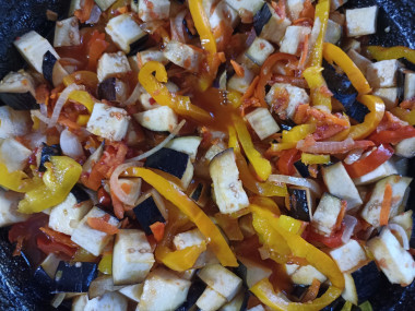 Отправьте в казан баклажаны, болгарский перец и томаты.