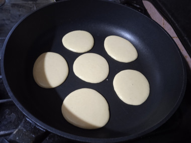 Сковороду с антипригарным покрытием разогрейте. Панкейки жарятся на сухой сковороде, выбирайте качественную, к которой не прилипнут блинчики. Выложите на сковороду 2 ст.л. теста, формируя круглый блинчик диаметром около 10 см. Когда на поверхности теста появятся пузырьки, переверните блинчик на другую сторону.