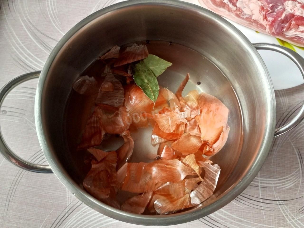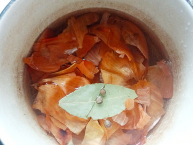 Приготовьте луковый отвар. Для этого в глубокую кастрюлю налейте примерно 1 л воды, добавьте соль, луковую шелуху, лавровый лист и перец горошком. Поставьте кастрюлю на средний огонь и доведите до кипения. О выборе подходящей кастрюли читайте после описания рецепта.