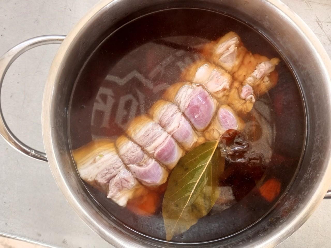 Опустите пузанину в луковый отвар, снова доведите до кипения, затем огонь убавьте и варите на медленном огне 1-1,5 часа. Готовую пузанину оставьте до остывания в отваре. Когда рулет остынет до теплого состояния, достаньте его и поместить под пресс до полного остывания. Можно поставить в прохладное место, например, на балкон.