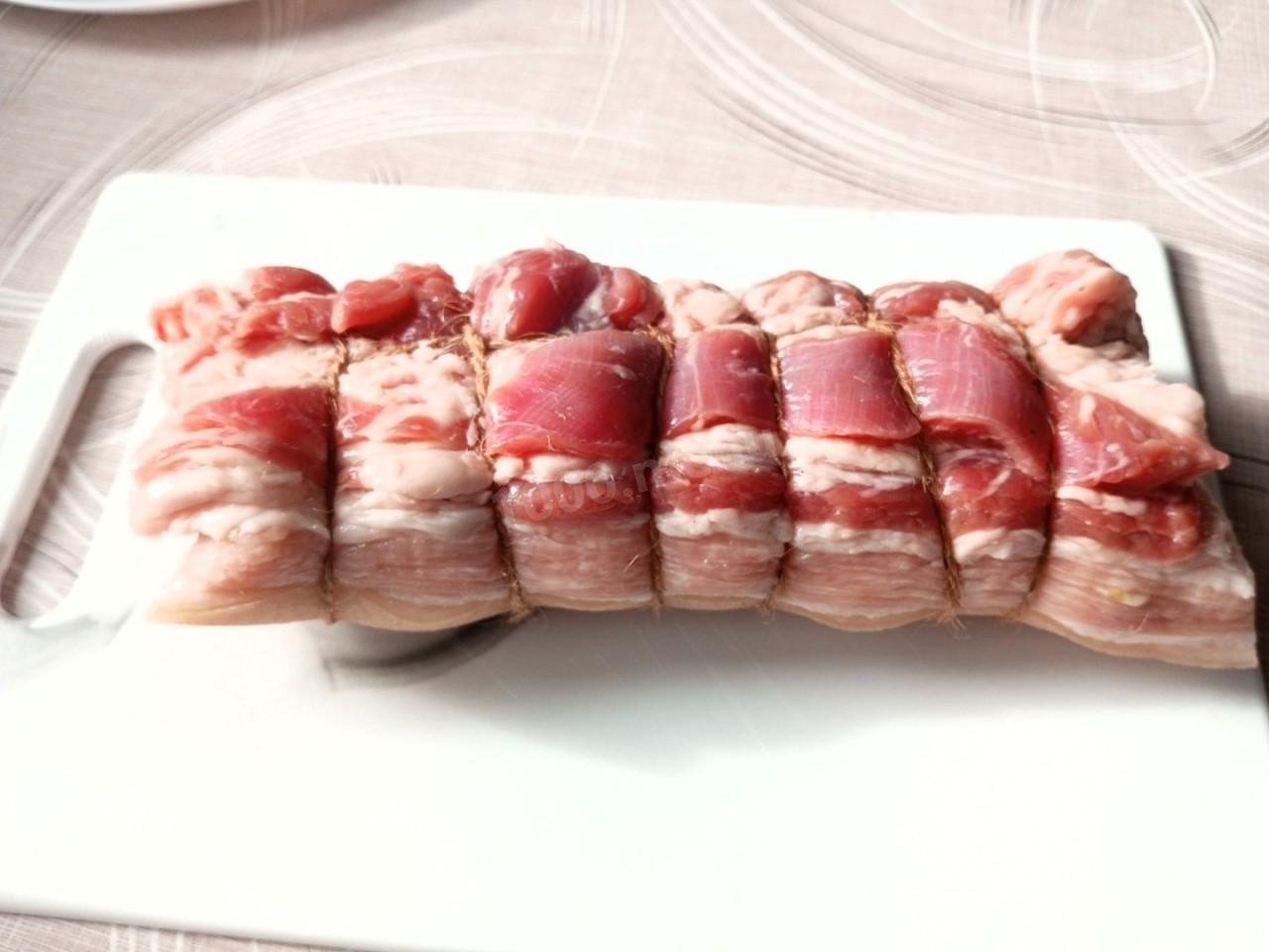 Пузанину промойте, обсушите бумажными полотенцами. Натрите солью натрите солью, поперчите молотым перцем, нашпигуйте дольками чеснока и сверните рулетом. Стяните нитками или бечевкой.