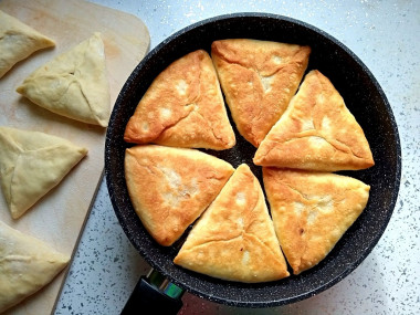 Переверните пирожки и жарьте до готовности. Таким образом пожарьте все пирожки. Подливайте масло по мере его выжаривания и прогревайте его.