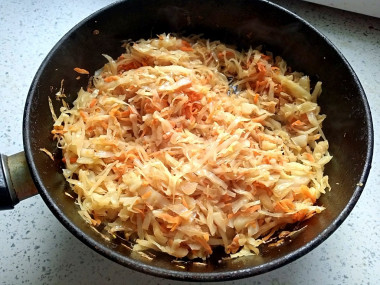 Капуста должна статья мягкой и не должна пригореть. Как определить готовность капусты? Попробуйте ее - если она не хрустит, значит готова. У меня на готовку ушло 10 минут. Начинку переложите в другую емкость и дайте остыть. Если вы используете старую капусту, то ее следуют протушить немного дольше и возможно придется подлить воды, поскольку она не такая сочная как молодая.