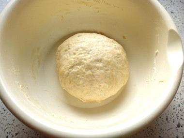 Какой консистенции должно быть тесто? Оно должно быть слегка липковатым, мукой его забивать не стоит. У меня ушло ровно столько муки, сколько я указала, плюс примерно 20-30 гр на подпыл. Вымесите тесто еще пару минут и сформируйте шар. Помогайте при этом себе мукой. Я вымешивала прямо в миске. Обваляйте колобок в муке, накройте миску пищевой пленкой и оставьте на 20 минут для отдыха.