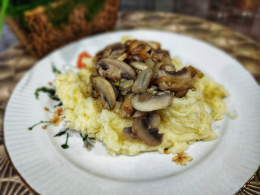 На тарелку выложите картофельное пюре, а сверху обжаренные шампиньоны. Подавайте к столу в горячем виде. Приятного аппетита!