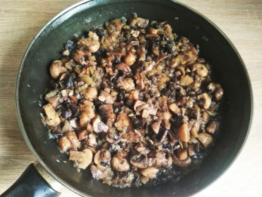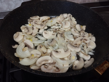 Пока отваривался картофель, занялась приготовлением грибов. Грибы порезала пластинками,выложила в сковороду,перемешала и обжарила. Добавила порезанную полукольцами луковицу и измельчённый чеснок. Обжарила всё вместе до готовности.