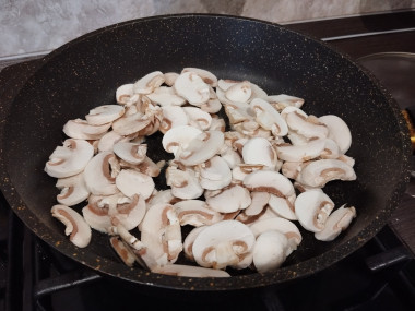 Пока картофель варится займитесь приготовлением грибов. Грибы можно взять любые на своё усмотрение. У меня свежие шампиньоны. Промойте шампиньоны тщательно в проточной воде. Затем нарежьте грибы крупными ломтиками. На горячую сковороду налейте немного растительного масла и выложите нарезанные грибы. Обжаривайте грибы 10-12 минут, периодически помешивая.
