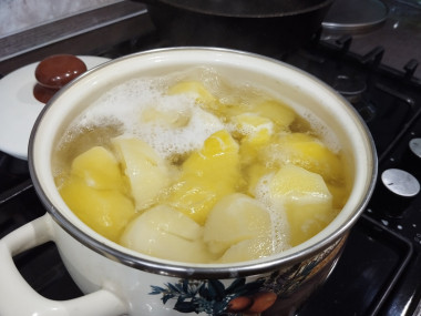 Очищенный картофель сложите в кастрюлю для варки. Если картофель крупный то его можно разрезать на 2-3 части. Так он быстрее сварится. Залейте картофель водой, чтобы он был полностью в неё погружен. Поставьте кастрюлю на огонь и доведите до кипения. Варите картофель на небольшом огне 20-30 минут. Картофель должен стать мягкий.