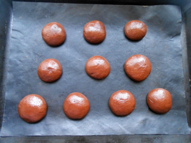 Охлажденное тесто разделите на 12-14 одинаковых частей и сформируйте из них полукруглые пряники. В процессе выпекания благодаря разрыхлителю пряники увеличатся в размере и округлятся, приобретая нужную форму.