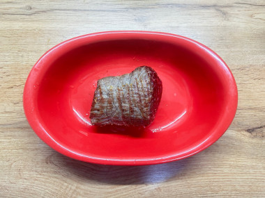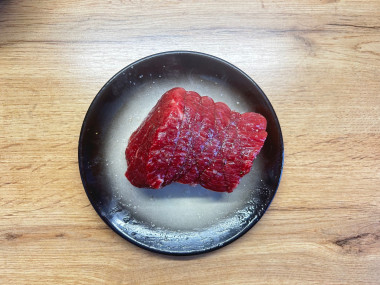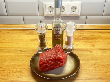 За час до готовки выньте мясо из холодильника и оставьте при комнатной температуре. Если этого не сделать, то мясо пропечется неравномерно – сверху покроется корочкой, а внутри останется сыроватым. Говядину промойте, срежьте все пленки и жилки и обсушите бумажными салфетками.