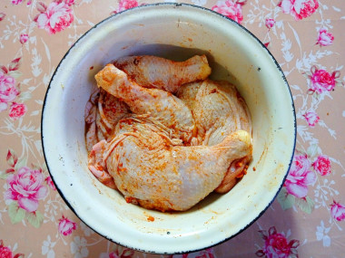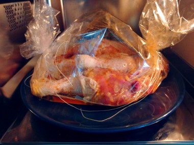 Для приготовления я взяла четыре куриные ноги (получился как раз килограмм). Все необходимые ингредиенты для маринада у меня были. Мариновала я курицу около 40 минут, после чего выложила её в рукав для запекания. Рукав завязала обычными нитками (я не стала использовать идущие в комплекте с рукавом зажимы, поскольку не уверена, что их можно использовать в микроволновке).