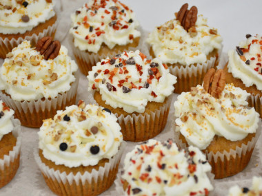 Просто восторг! Рецепт этих банановых капкейков теперь будет одним из моих любимых! Я приготовила всю эту красоту на день рождения подруги, причём и есть, и готовить такие банановые капкейки - сплошное удовольствие… Все ингредиенты предельно просты, процесс их объединения тоже. Смело готовьте, не пожалеете, особенно на праздничный стол. Получается гораздо быстрее какого-нибудь сложного торта, а по вкусу банановые капкейки ему ничуть не уступают. Я во всём следовала рецепту, уклонилась от него лишь в смеси орехов и украшении: у меня был грецкий и пекан напополам (по вкусу в выпечке разницы нет). И я не украшала готовые изделия кусочками бананов, потому что их ждала долгая транспортировка и нахождение на праздничном столе при комнатной температуре (кусочки банана тогда приобрели бы не совсем товарный вид). Украсила банановые капкейки дробленными орехами, какао-крупкой, сублимированной клубникой и кондитерской посыпкой. Большое спасибо автору за рецепт!