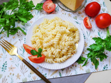Макароны взяла из пшеницы твердых сортов. Сварила их, а затем слегка обжарила на сливочном масле. Еще один кусочек масла добавила на макароны сверху. Когда масло полностью растаяло, добавила в сковородку молоко. Держала макароны под крышкой на маленьком огне минуты 3. Жидкость за это время почти полностью испарилась.