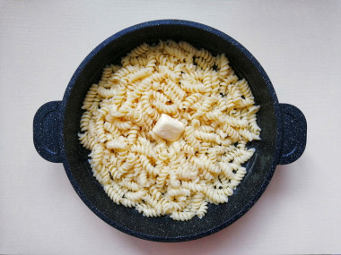 Возьмите сковороду такого размера, чтобы в нее вместилась вся порция макарон. Разогрейте на ней сливочное масло. Делайте это на маленьком огне, чтобы масло не начало гореть.