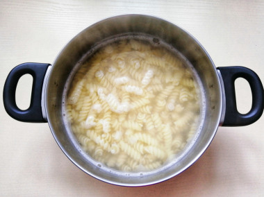 Вскипятите в большой кастрюле воду для варки макарон. Чтобы они не слиплись и получились вкусными берите на каждые 100 грамм макарон 1 литр воды. Воду посолите. Засыпьте макароны. Обязательно перемешайте их, чтобы они не прилипли ко дну кастрюли.