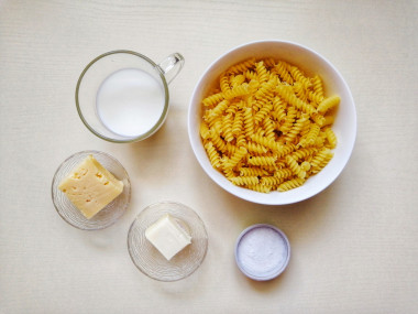 Как сделать макароны с молоком и сыром на сковороде? Подготовьте продукты. Макароны можете брать любой формы, это не принципиально. Мне просто удобнее работать с небольшими пружинками. Для спагетти я выбираю другие рецепты. А вот на качество пасты советую обращать особое внимание. Самая вкусная паста - из пшеницы твердых сортов. Она не разваливается при варке и содержит больше полезных веществ. Сыр выбирайте лучше тот, который хорошо плавится.
