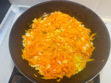 Репчатый лук мелко порежьте, морковь натрите на крупной или средней терке. В сковороду налейте растительное масло и разогрейте на среднем огне, положите репчатый лук и морковь. Обжаривайте овощи на среднем огне в течение 5-6 минут, перемешивая. Какое масло лучше всего взять для приготовления можно прочитать под шагами ниже.