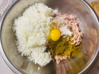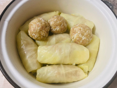 В фарш кроме всего по рецепту, добавила еще яйцо, ну есть у меня в семье товарищ, который не будет есть капусту, для него сделала немного тефтелей.