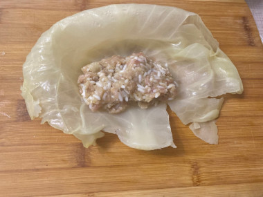 Разделите подготовленный фарш на части, по количеству равные отобранным листьям. На каждый капустный лист положите фарш и, подвернув края, сверните голубцы.