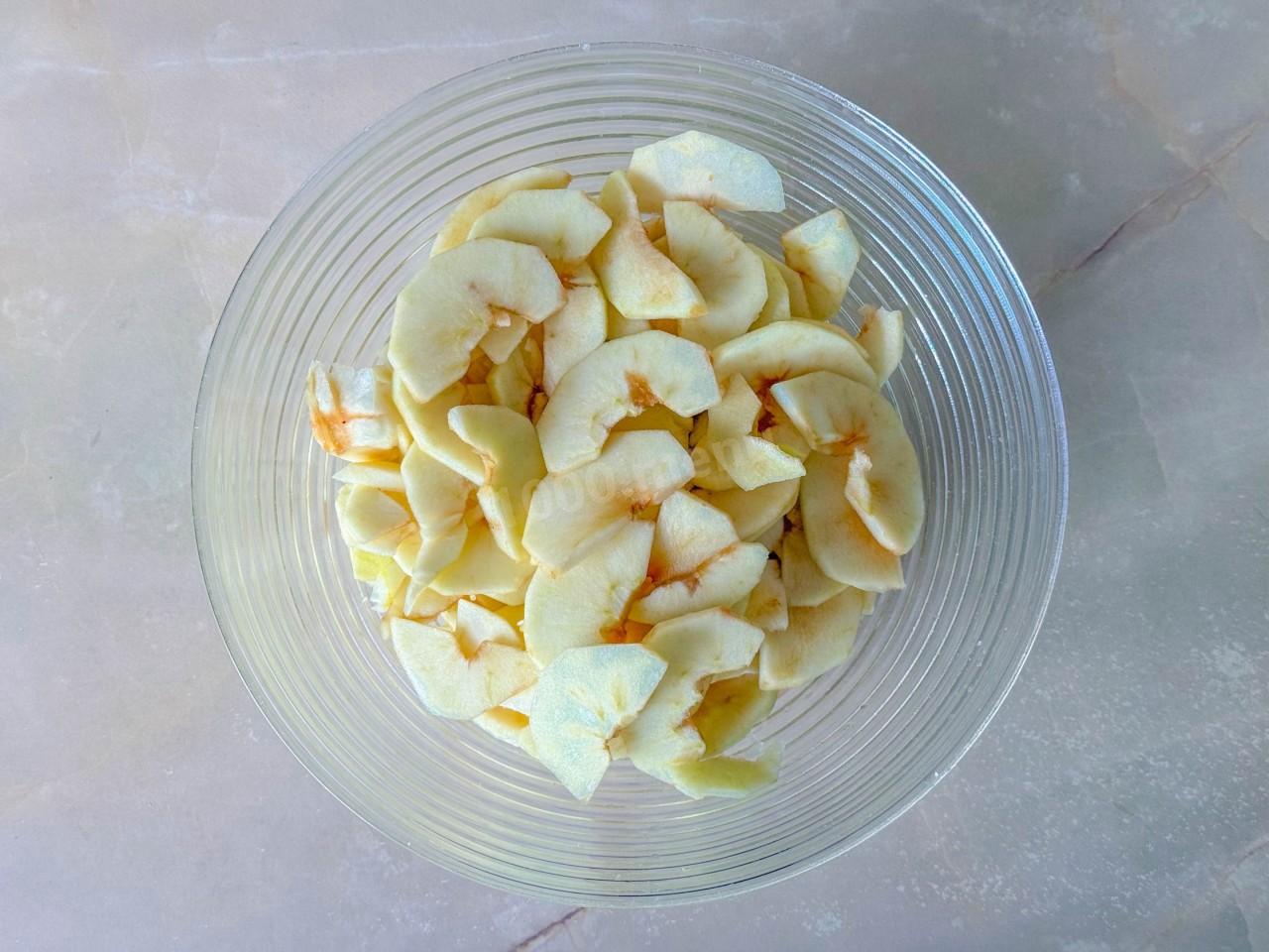 Нарежьте яблоки крупными брусочками, полейте их выжатым лимонным соком.