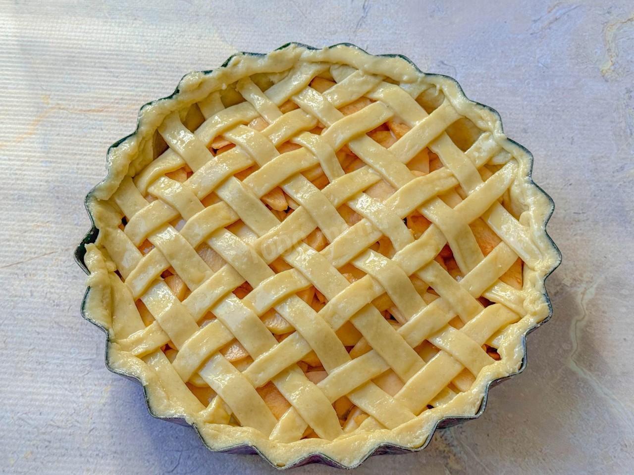 Для формирования сетки расположите полосы теста в одном направлении. Затем расположите полосы поперек(перпендикулярно), чередуя через один. Из остатков теста сделайте украшение для пирога или укрепите бортик. Смажьте пирог взбитым яйцом.