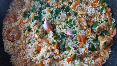 Как сделать плов с куриным филе на сковороде? Подготовьте продукты. Овощи и зелень помойте, куриное филе разморозьте (если оно было заморожено), сполосните и обсушите бумажным полотенцем. Рис лучше подойдет круглозерный, не пропаренный. Зелень и специи берите по вкусу.