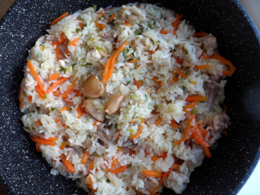 Переложите плов в большую тарелку, наверх положите дольки чеснока и подавайте к столу.