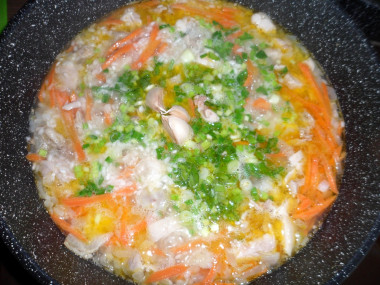 Зелень мелко порубите и добавьте в сковороду с пловом.