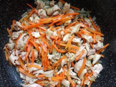 Морковь почистите, и нарежьте тонкой соломкой. Положите ее в сковороду с луком и филе. Если не любите морковь соломкой, можете натереть на крупной терке или нарезать мелким кубиком.