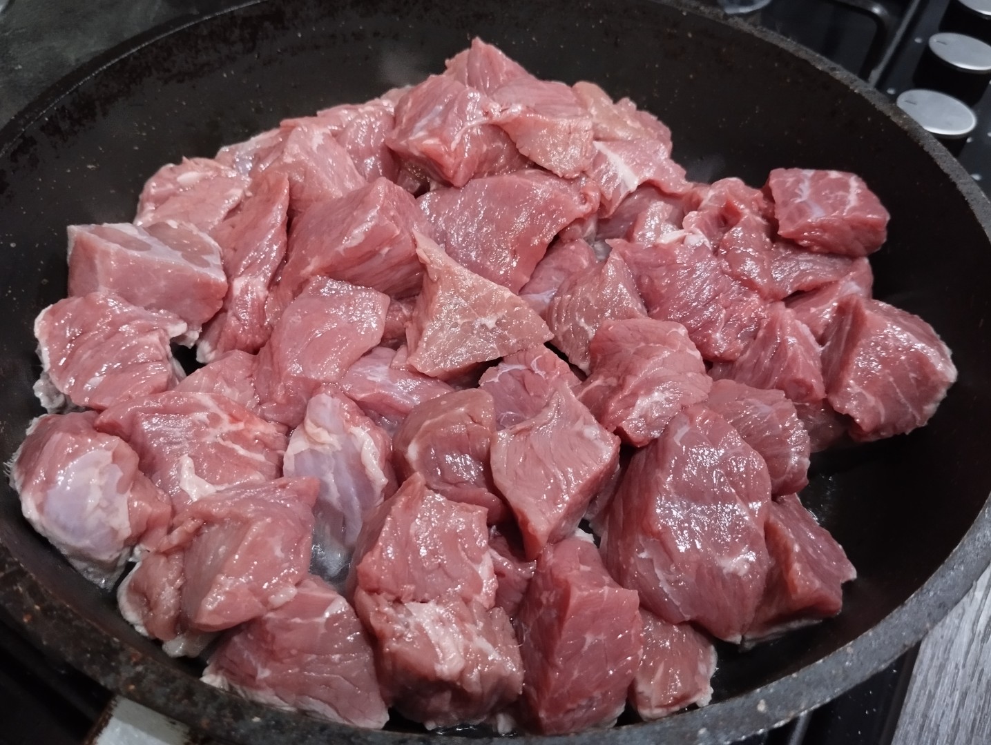 Мякоть говядины нарежьте порционными кусками. Говядина нужна без костей и крупных жестких жил, только мякоть. Вымойте мясо, обязательно обсушите бумажным полотенцем, иначе излишняя влага не даст ему обжариться - оно будет тушиться. Мясо можете брать от любой части туши. У меня тазобедренная часть.