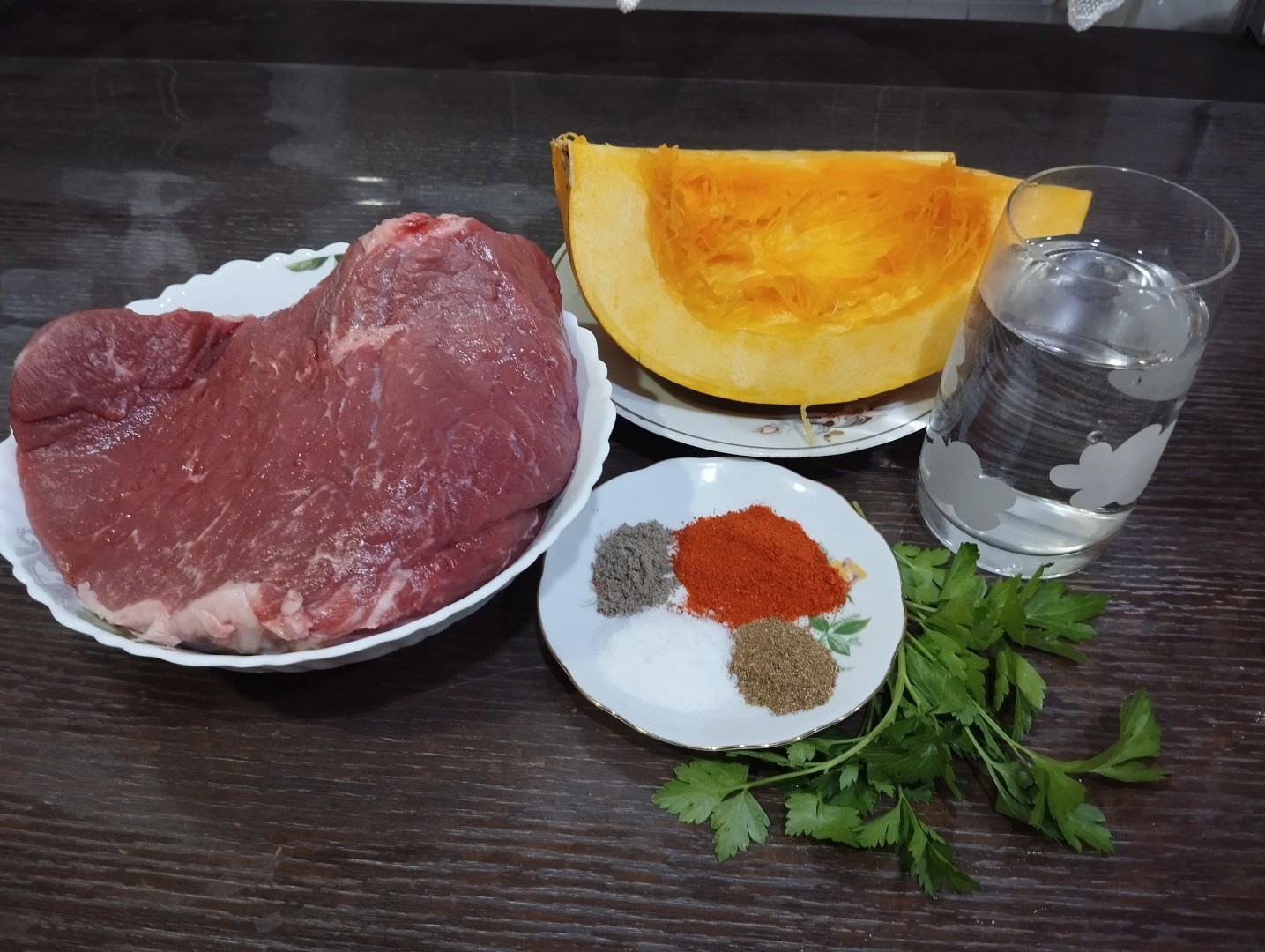 Как сделать говядину с тыквой в духовке? Очень просто! Для начала подготовьте необходимые ингредиенты по списку. Можете заменить говядину на телятину. Овощную часть можете дополнять по своему вкусу. Воду можете заменить на мясной или куриный бульон. Часть воды можете заменить на белое вино.