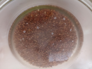Берите миску поглубже, - ведь гречка сильно увеличится в объеме. Залейте водой. Воду берите из расчета на 1 стакан гречневой крупы 2 стакана воды. Немного посолите.