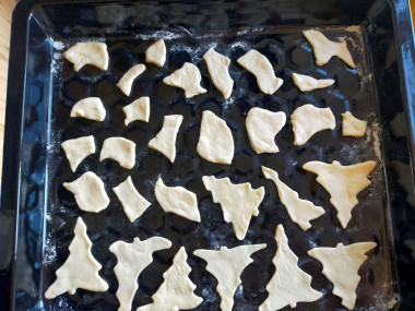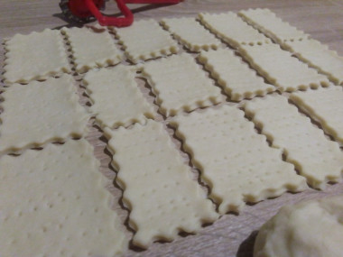 Фигурным ножом разрежьте тесто на небольшие прямоугольники. Если остались обрезки, соберите их в шар, раскатайте и снова вырежьте ножом или формочками.