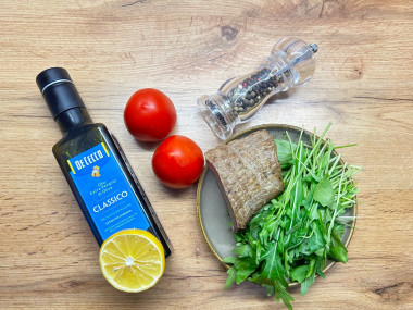 Рукколу вымойте и дайте обсохнуть. Крупные листья порвите руками, мелкие оставьте так. Помимо рукколы можете взять и любую другую зелень по вкусу - укроп, петрушку и базилик.