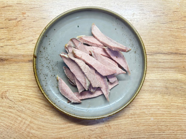 Нарежьте ростбиф небольшими одинаковыми кусочками или полосками.
