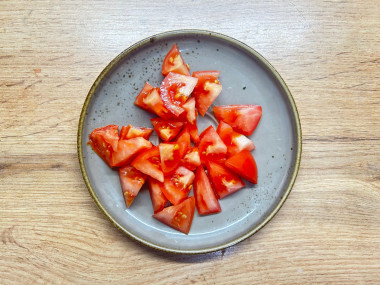 Помидоры вымойте, обсушите и нарежьте дольками. Выбирайте для этого салата крепкие, плотные помидоры, чтобы они не распадались во время перемешивания, но и не зеленые. Отлично подходят томаты на ветке или сливовидные.