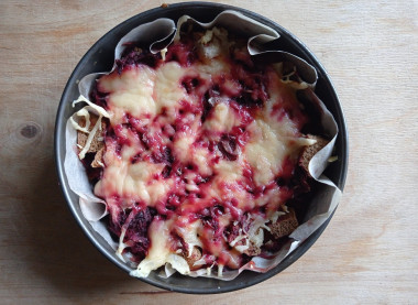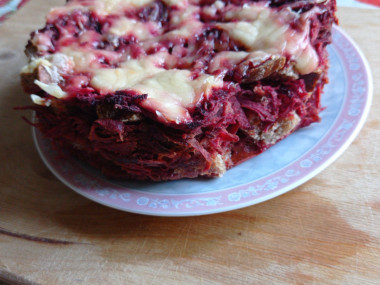 150 граммов свёклы - это достаточно малое количество, поэтому я взяла продуктов на три порции. Сметану заменила майонезом. У меня получилось три слоя хлеба и три слоя свёклы. Запеканку делала в круглой разъемной форме диаметром 17 см.