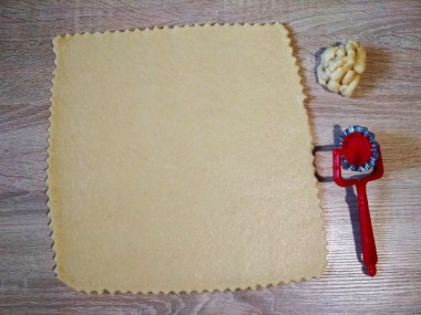 7. Затем раскатайте тесто в тонкий пласт (примерно 0,3 см). Посыпьте его сахаром и сверху еще раз слегка раскатайте, вдавив сахар в тесто. Формочками вырежьте печенье.
