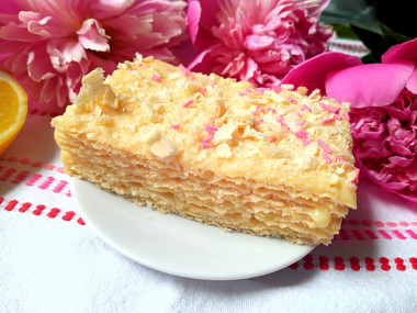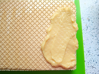 На круглый вафельный лист диаметром 20 см уходит примерно 2 столовых ложки крема. Полученного по этому рецепту количества хватает на 5 таких листов.