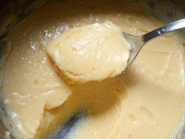 Доведите молоко до кипения и сделайте огонь ниже. Непрерывно перемешивая, тонкой струйкой, влейте полученную смесь. Как только крем загустеет (на это уходит около 5 минут в зависимости от вашей плиты), снимите с огня и хорошо взбейте. Если крем вам покажется жидковатым, не волнуйтесь, после остывания он станет гуще. Чтобы крем не покрылся корочкой, нужно сверху накрыть его пищевой пленкой так, чтобы она плотно лежала на креме.