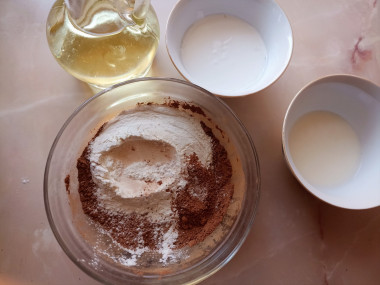 Поместите какао-порошок, растительное масло, сахар, сметану и молоко в одну посуду. Можно сразу смешать все в кружке, но удобней все таки делать это в широкой чаше.