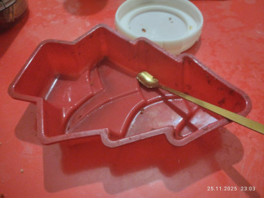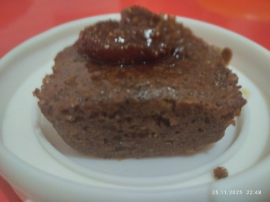 Получилось вкусно! Запах кекса чувствовался ещё до того как открыла микроволновку. Сверху так же добавила клубничное варенье в конце, без него суховато. Напоминает бисквит с какао, хоть и без яиц. К форме у меня ничего не прилипло, благодоря маслу как понимаю. Думаю что за такое короткое время - супер. Вместе с чаем "улетел" за минуту😂🙌 На фото только кусочек, его "урвала" для отзыва. Из-за формы ещё и новогоднего настроения добавилось😋
